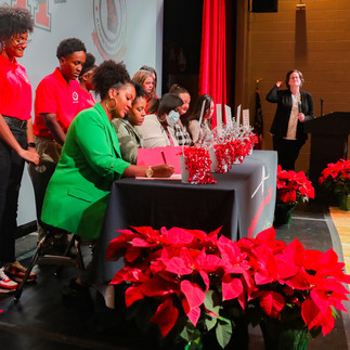 Baldwin County School District is proud to announce the new cohort of 2023 REACH Scholars: Allyson Roman-Lopez, Shakyne Dubose, Naomi Barnes, Kaylin Quinn, and Travis Butler. These outstanding students, along with their parents, participated in the REACH Signing Ceremony held at Oak Hill Middle School on December 11th, cementing their commitment to surpassing the rigorous academic and behavioral standards outlined in the program. The ceremony was presided over by Principal Manzie Broxton, Superintendent Dr. Noris Price, Deputy Superintendent Matt Adams, Amy Taylor, 8th Counselor as well as leaders from across the Baldwin community.